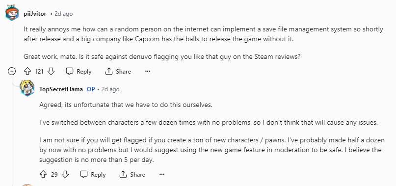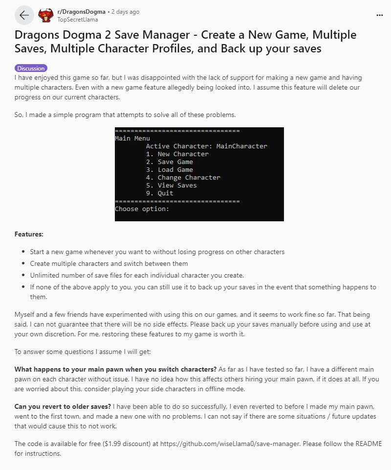 而游戏中仅提供一个存档位的设计令许多玩家感到不满,因此有位名叫“TopSecretLlama”的reddit用户,在论坛中分享了他开发的可以创建新游戏、多个存档及多个角色切换的额外存档工具,并且经过他和他朋友的测试,效果十分理想。