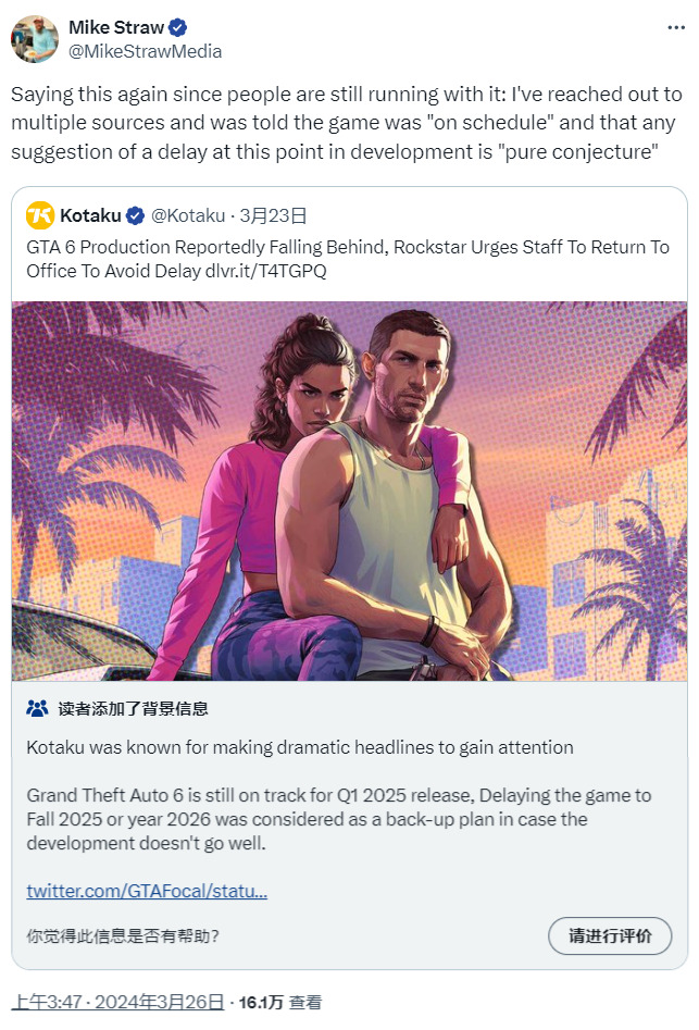 而现在Insider Gaming的另一位编辑Mike Straw再次发文解释,他们已经联系了多个消息来源,并被告知《GTA6》仍按计划推进中,目前在开发阶段的延期说法都是“纯粹的猜测”。