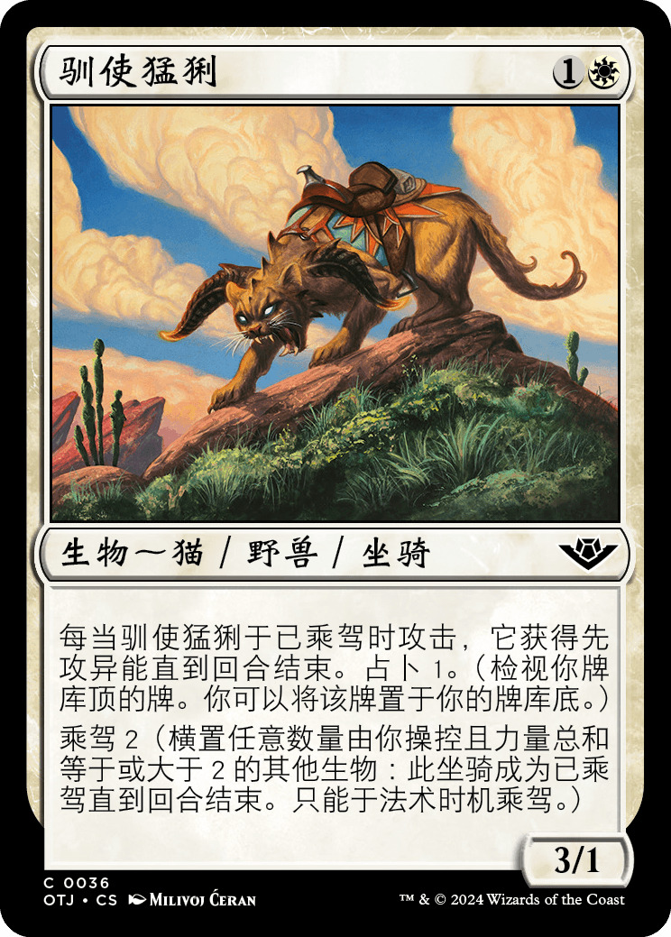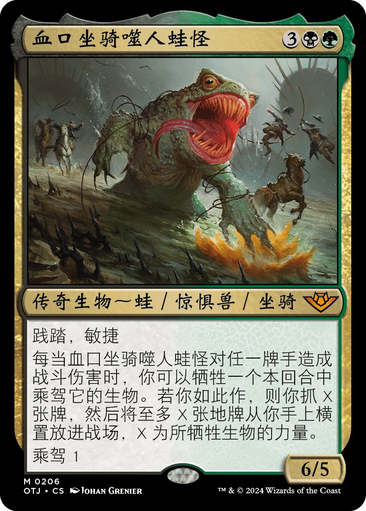 于乘驾异能结算时,该坐骑就会成为已乘驾直到回合结束。这本身并没有任何规则含义,但该牌上的其他异能可能会关心该坐骑是否已乘驾。许多坐骑会具有驯使猛猁这类简单的触发式异能~会在「每当坐骑于已乘驾时攻击」时触发者。但有的坐骑会在你策马狂奔时给你带来更多好处。就像我们的老朋友噬人蛙怪~虽然它对乘驾它的骑手不太友善,但你最终仍能获益。