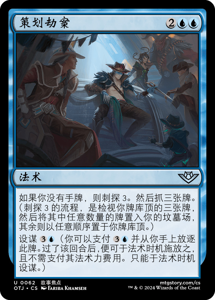 设谋是规划未来回合行动的绝佳方式,因为你已有现成咒语可用,且不需额外为其支付法术力。或许你是想要充分利用策划劫案,希望在它结算时自己没有手牌。抑或你只是还在苦苦等待第二点蓝色法术力来源。无论原因为何,设谋该牌都能让你在未来的回合中大展宏图。