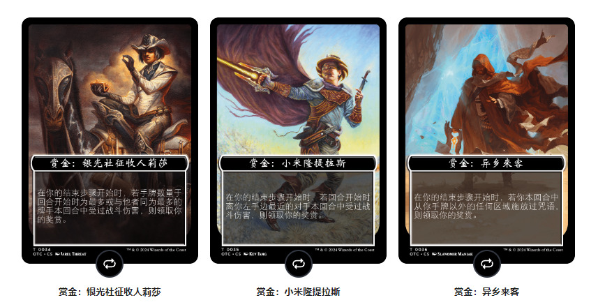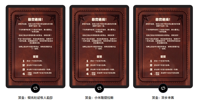 如果你们的游戏中包括赏金玩法,则所有牌手会共用一副赏金套牌,其中须包括12张赏金牌中的至少6张。赏金套牌中一种赏金牌不得多于一张。毕竟逮住他们之后,再度对同一个人悬赏就说不通了,对吧?这样纯粹就是浪费金钱。