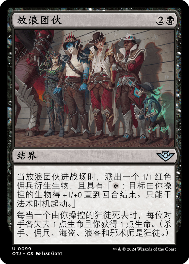 狂徒可以单独成词使用(亦即用作名词),此时指的是具一种或数种以下生物类别的永久物:杀手、佣兵、海盗、浪客和邪术师。你会经常看到异能上会用到这样的字眼(例如放浪团伙):「(一个)由你操控的狂徒」。这种写法仅指战场上的永久物,不包括在其他区域当中的咒语或牌张。虽然狂徒基本上都是生物,但具有一个或数个相应生物类别的亲缘永久物(此牌张类别此前称作「部族」,并不算常见)也会是狂徒。千真万确。
