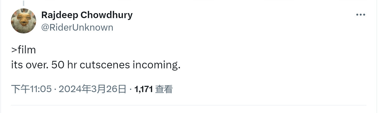 有玩家开玩笑地说:那完了,50小时的过场动画要来了