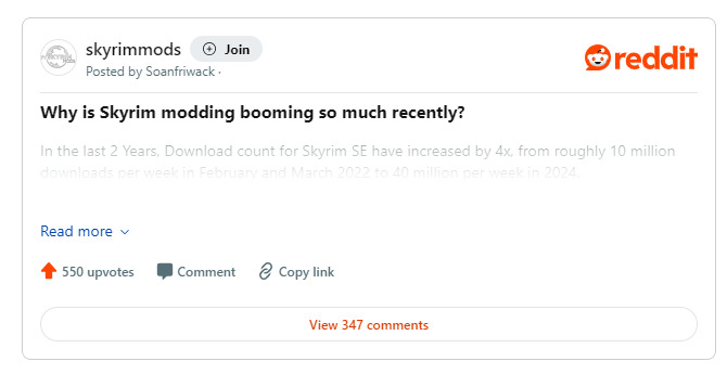 提起B社旗下名作,虽然《星空》褒贬不一,不过老游戏《上古卷轴5》依然经典不落幕,至今依然人气不减,日前有玩家表示《上古卷轴5》N站MOD下载近两年暴涨四倍,引发热议。