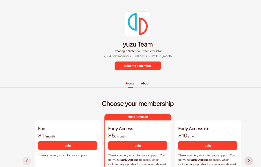 更关键的是,YUZU模拟器的开发团队还在众筹平台Patreon上开启了付费订阅的功能。并在任天堂至关重要的大作《塞尔达传说:王国之泪》发售前,就公开支持模拟这款游戏,期间订阅数翻了一倍。