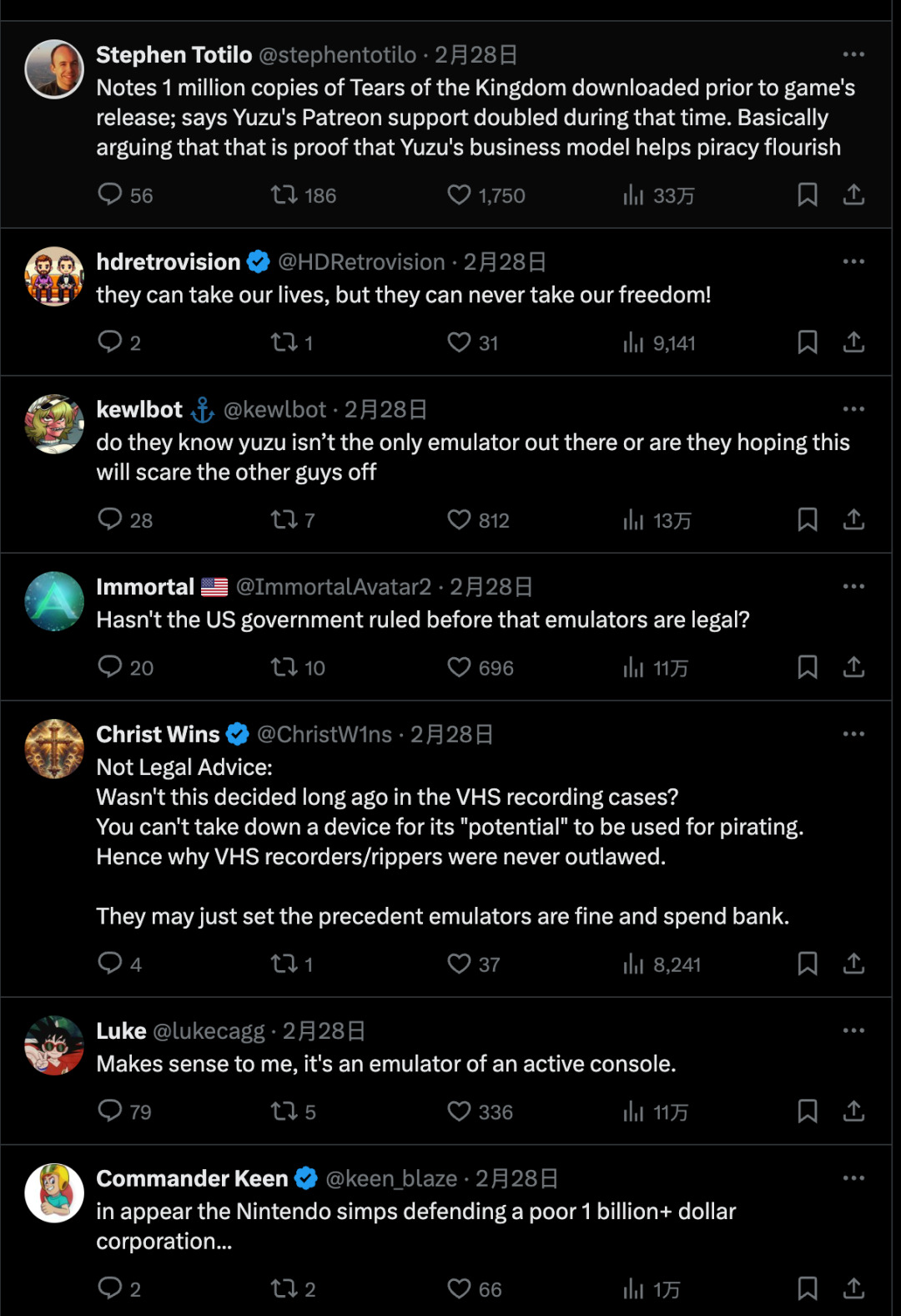 舆论混杂着各种声音,当然有许多人支持任天堂打击助长盗版之风的YUZU模拟器,但也有人认为大企业应当花更多功夫在提升用户体验上,而不是挤兑民间开发者;