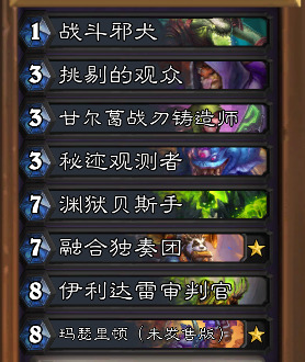 - 渊狱贝斯手:能够选取的原因很简单,配合刀大多数情况下只需要1费就可以拍下,6-5嘲讽吸血,不同于玛瑟里顿,下回合就可以动,有压力时的选择。 抓取建议:只推荐3-5费