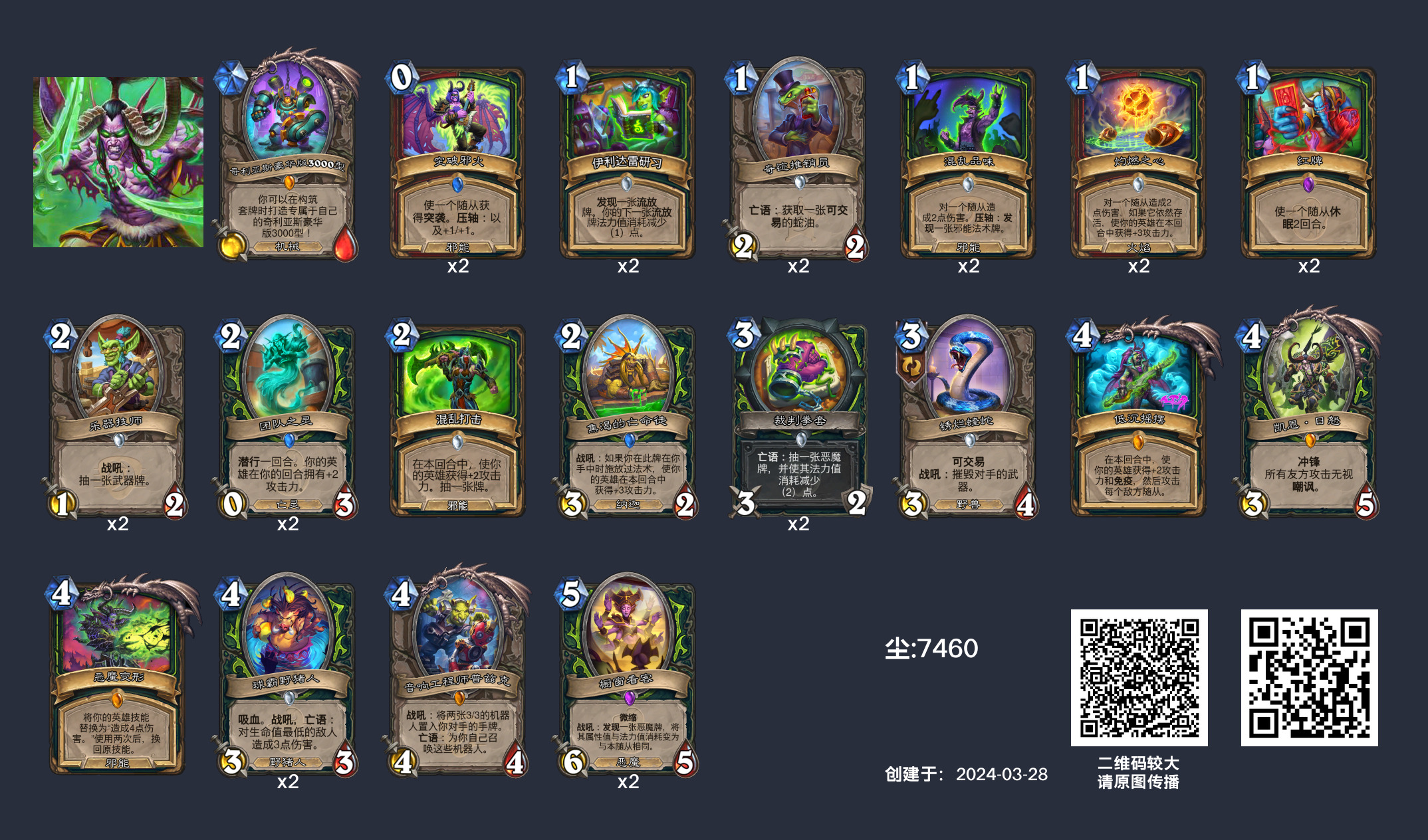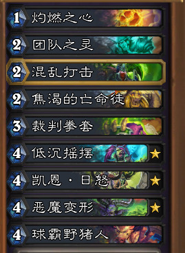 简单说说伤害,之前说过这套的核心在于恶魔,剩下的卡大多数是陪衬,也就是补足费用和伤害,优先级肯定低于上面两点。这些卡就要根据场面去使用了,在5-6费完成我们节奏后,就是叠加伤害准备斩杀了。这里重点提一下低沉摇摆,这是我们这套仅有的aoe(剩下的只能靠研习或者混乱品味去找了),尽管我们可以利用凯恩过墙,但是免疫的效果可以让圣骑或术士没办法吸血。灼燃之心必要时可以打自己的怪提高斩杀。球霸野猪人最低生命的效果有时有奇效。
