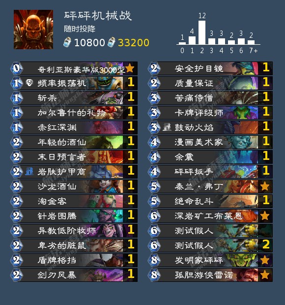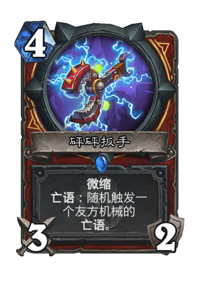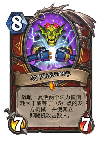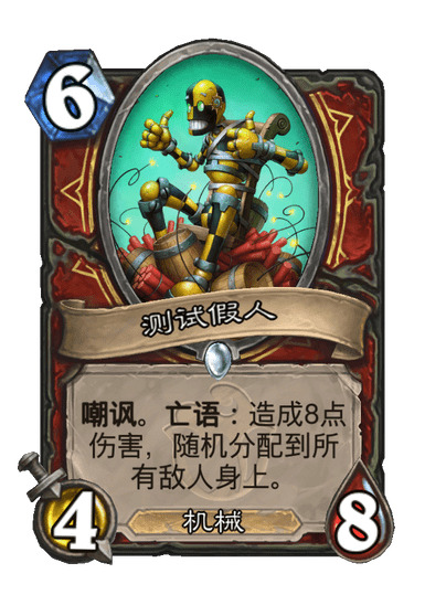 新版本配合机械战的新卡有好几张,但我只选择了4费武器砰砰扳手,首先是因为另外几张都是紫卡,没抽到合不起,另外我也不觉得那几张卡能用。4费的武器首先可以作为一个斩杀手段,砰砰在场的情况下,装上后立刻替换微缩版1费武器砍一刀,触发两次亡语,一共是5费17点伤害,但实战中对手一般不敢留你假人站场,这时候武器的优势就体现出来了,你可以在4费时提刀砍一刀,6费时拍假人再砍一刀直接亡语打8,这波节奏十分强大,此时若手里有第二张假人,7费拍假人再提上微缩刀又是一波同样巨强节奏。7费就算没有假人,直接奇利亚斯冲出去也是不弱,此外还可以视情况弗丁末日或者脏鼠乱斗,总之拖到10费我们就无敌了。在大后期,如果我们带着刀,砰砰生出两个奇利亚斯两个测试假人的情况下,我们可以用8费空场斩杀30+武器攻击力的伤害,这卡组的斩杀线非常之高,只有玩过才知道。相比于武器的强节奏,新卡3费的炮灰出动就面临一个很尴尬的问题,就是测试假人站不住场,你想拍下去后立刻用,那就得等到9费,黄花菜都凉了。新卡5费的化工泄露,由于我们最高费随从不是测试假人,所以用不了,这卡有待开发,但绝不适合这套卡组,5费拉个6费假人完全不赚,而且这个效果可以被1费的频率震荡机完美替代。还有另一张5费亡语机械焰火机师,谁用谁知道,非常弱。
