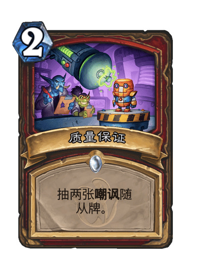 这套牌中有大量过牌和定向检索组件,整个卡组都在想办法尽快找到测试假人,所以基本不用担心宇宙触发不了,何况没抽到测试假人的情况下,宇宙触发了也赢不了。其中最优秀的定向检索是2费的质量保证,抽两张嘲讽牌可能抽到测试假人、奇利亚斯、环境针对卡脏鼠、以及泰兰弗丁继续定向检索。在这副牌里,泰兰弗丁优先抽8费砰砰,砰砰上手了就抽7费奇利亚斯,奇利亚斯再上手了就可以抽6费的铜须或测试假人,此外还有新卡漫画美术家可以抽一张5费以上的牌,所以虽然核心组件很多,但我们依然能丝滑展开。