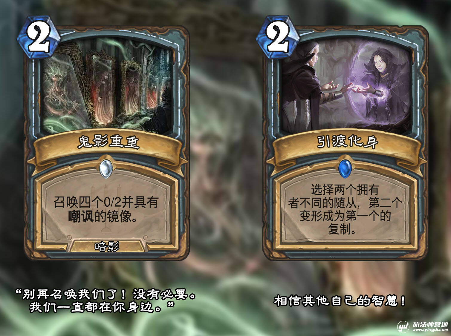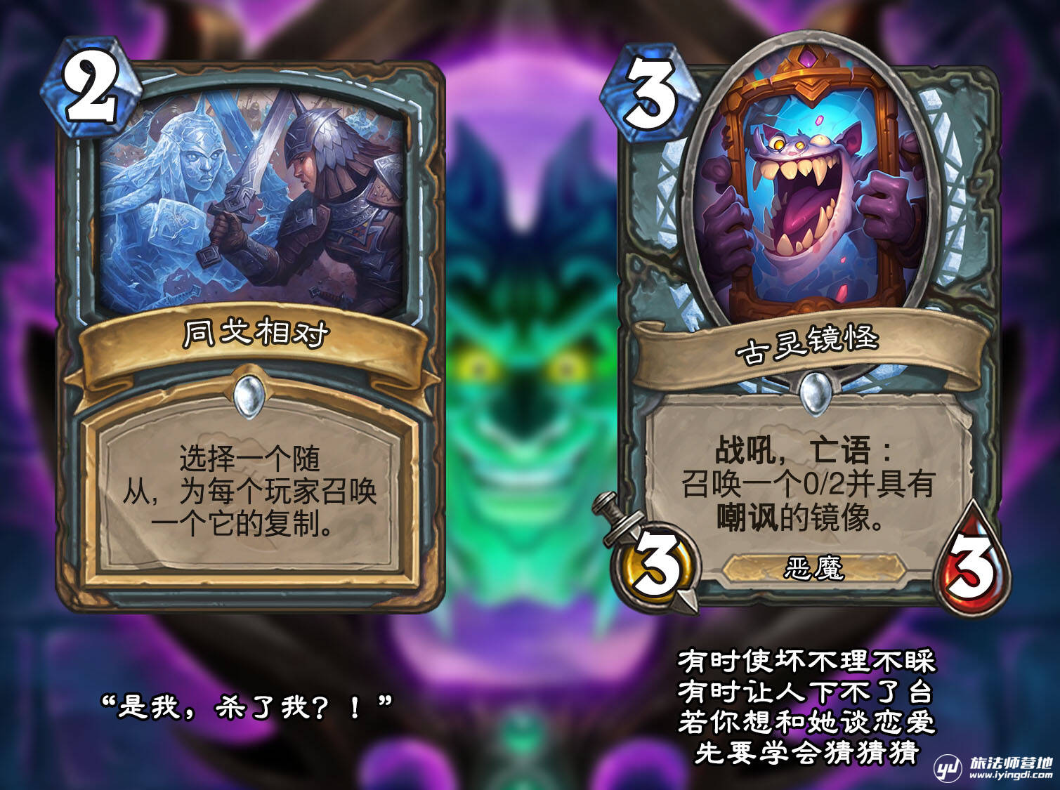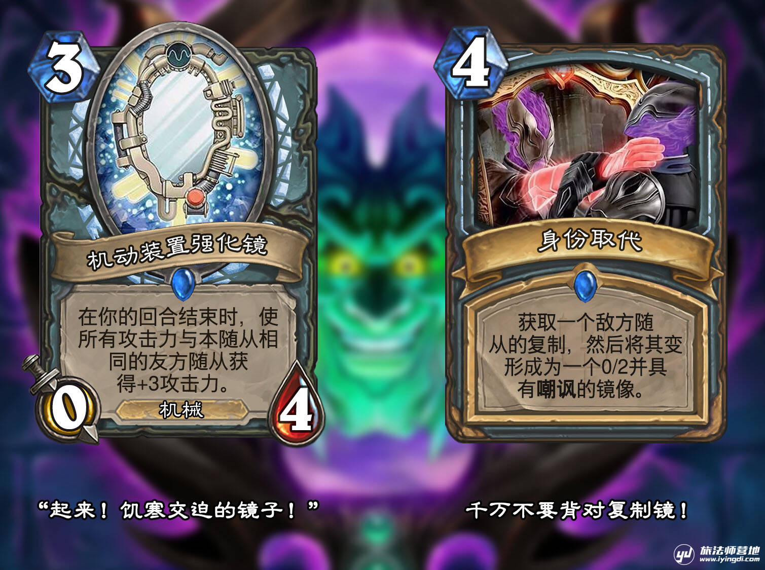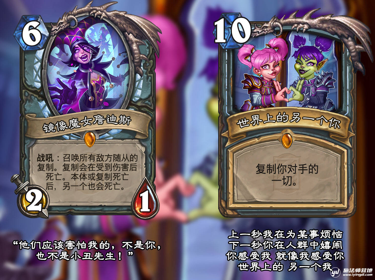 复制你对手的一切,指:你的职业、英雄、英雄技能、手牌、牌库、战场、头像区的任务奥秘等、玩家ID(仅限本局)都会变为你对手的复制。