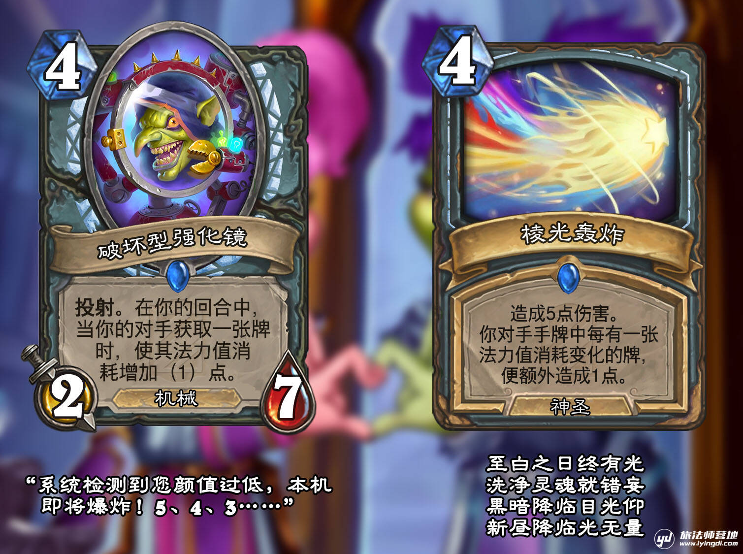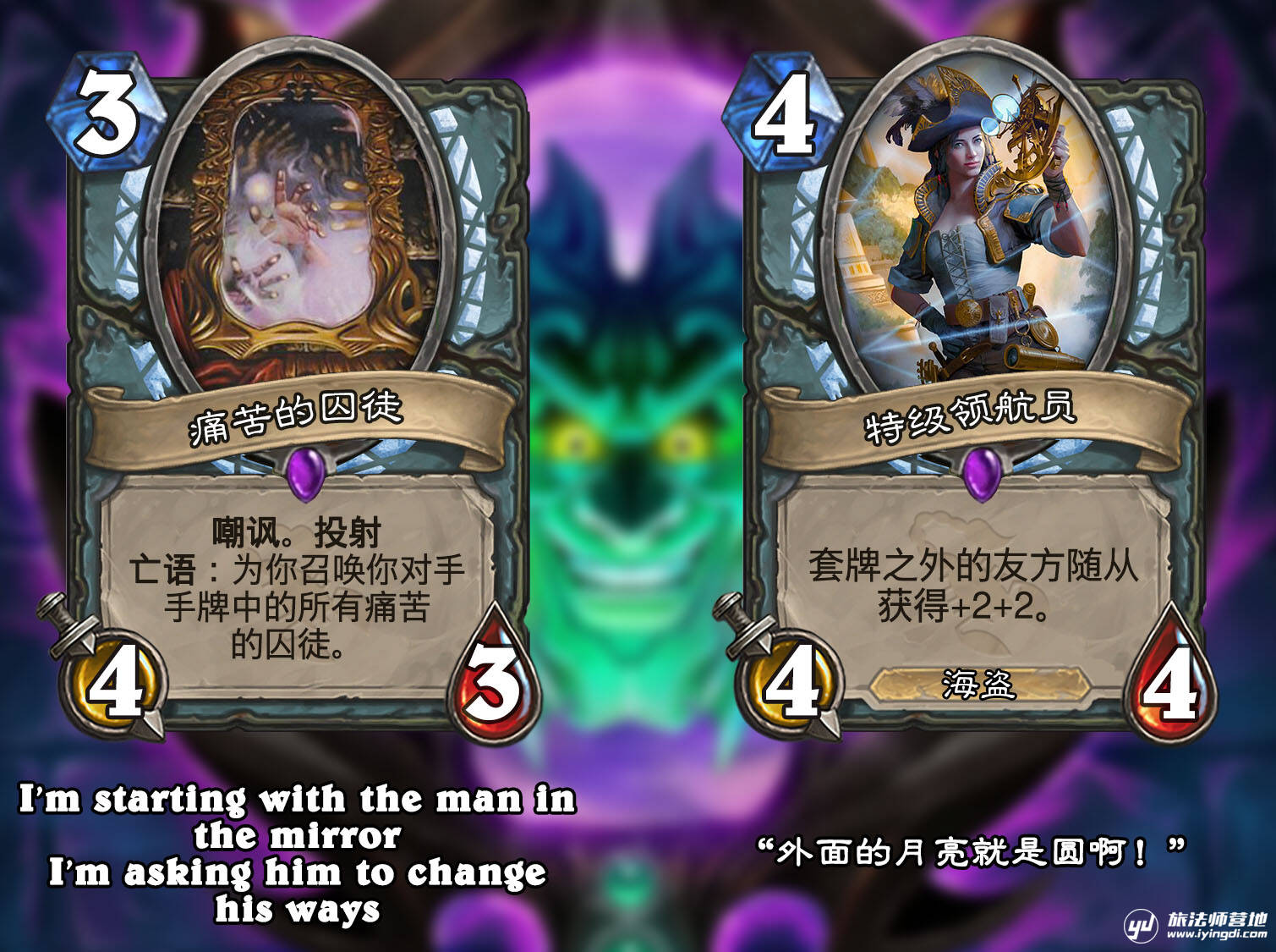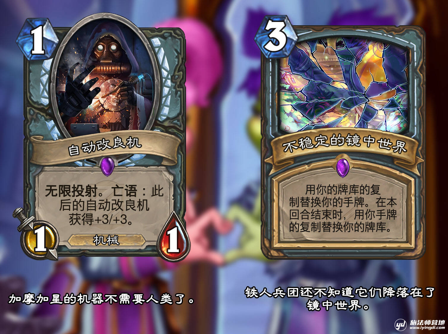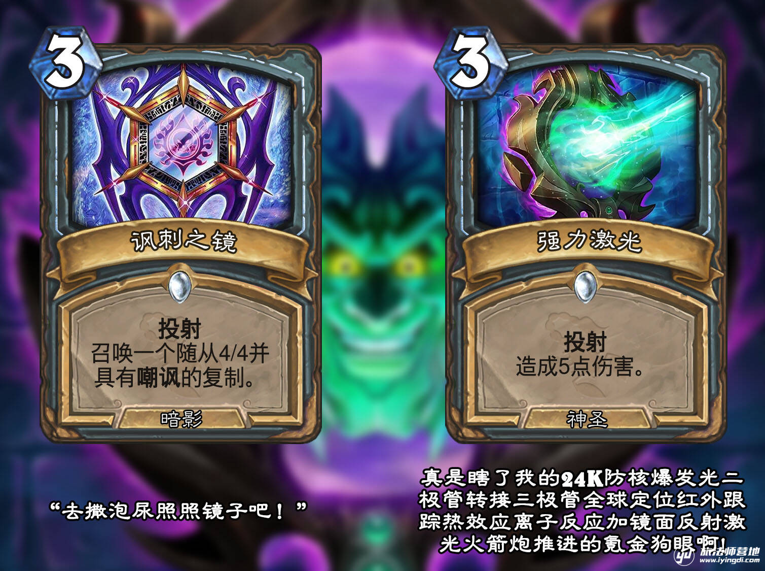 复制你对手的一切,指:你的职业、英雄、英雄技能、手牌、牌库、战场、头像区的任务奥秘等、玩家ID(仅限本局)都会变为你对手的复制。