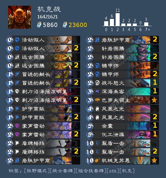 狂野战士这个版本几乎没有增强,奥丁还被砍了一刀。本人最开始打无限战,再到上个版本玩宇宙,狂野门批太多了,几乎能赢就靠神铜须双倍脏鼠换手吃手来打破坏,九费拍奥丁对面早就无限开门了,打不了一点。越来越吃力。于是搞了一套机克战玩玩。 主要思路是各种过牌,加上铸甲师 剃刀 艇长(或者五费打三)和各种低费随从来叠甲保命。最后泄漏+裂盾一击达成otk。一般在9费完成斩杀。胜率还不错,主要是一局很短,让我一个防战玩家感到了一丝丝爽感。有种要出货的感觉。