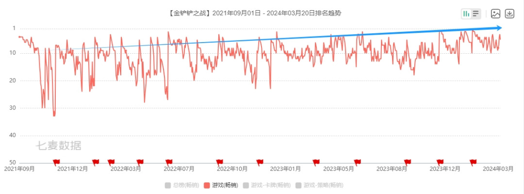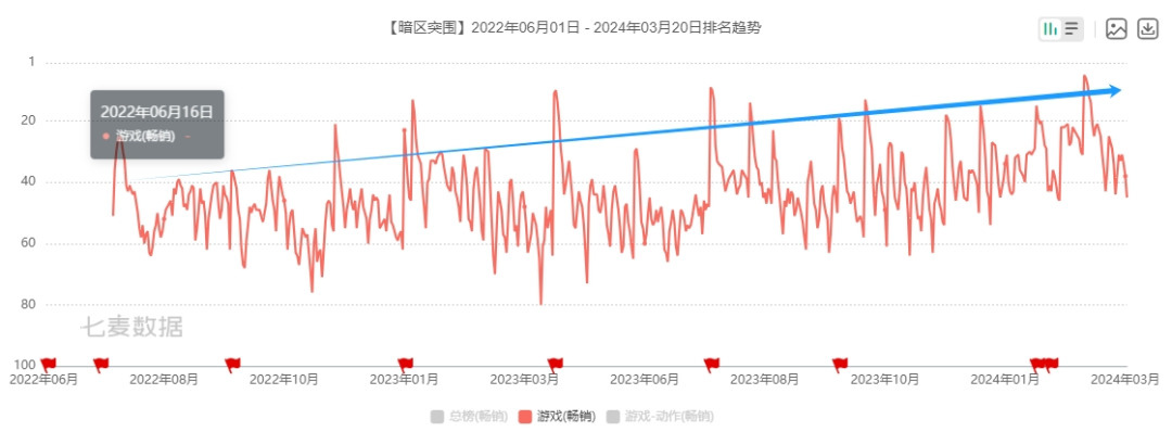 我们看了一下两款产品在畅销榜的走势图,很明显的就可以看《金铲铲之战》是从10-20的排名到现在稳定到了前10,而《暗区突围》则是40-60,现在稳定在了前40。