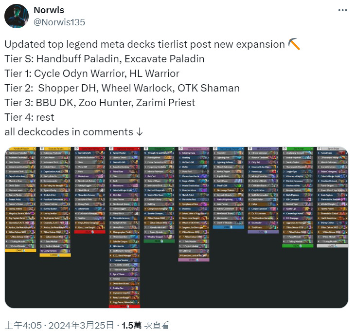 Norwis参考D0nkey上的卡组给出了当前他认为的传说分段卡组排行榜: