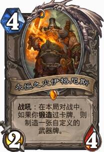 伊格尼斯是我觉得还不错的一张补质量单卡,当然有很多人觉得当前环境太快了造刀根本提不上,其实完全不用强求10费刀伊格尼斯的1费和5费刀也都很好用,尤其是再铜须后。解场可以双1费刀,剧毒亡语然后顶刀清场;血量很危险的时候可以找1费或者5费的吸血战吼;斩杀的时候可以拿10费的风怒战吼22点的斩杀。有必要时还能配合星空或者佐拉回手再造一次。
