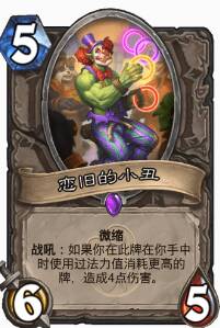 恋旧的小丑是我在预览之初就看好的一张牌(可惜不是腐蚀机制,不如还要强一大截),当时在我看来完全可以作为血誓的下位替代,在实战过后发现在当前环境下小丑的潜力完全不输血誓。目前标准里随着王子的退环境,有叠甲能力又只有战法德三个职业,而当前环境下德法沉寂,叠甲职业也就战士还在天梯上活跃(这也是为什么现在法强萨又开始冒头的原因),拥有7费24点空场过墙斩杀的小丑已经算很强的终结手段了。需要注意的是由于小丑不是腐蚀机制,不管是微缩拿到的小丑还是通过星空投影师和佐拉复制的1费小丑都需要再打一张2费及以上的牌来重新激活战吼。