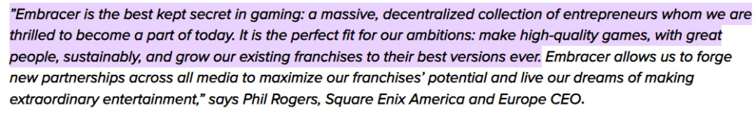 2022年,Square Enix欧美地区CEO的菲尔•罗杰斯曾如此说道:“Embracer是游戏界藏得最好的秘密”。