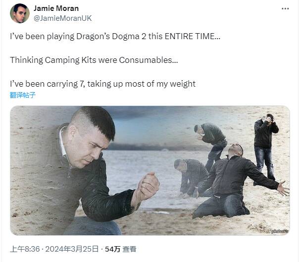 这位名叫“Jamie Moran”的推特用户,就有这样的错误认知,因此一直带着7套野营工具出门,可想而知这占据了他角色多少宝贵的负重度。