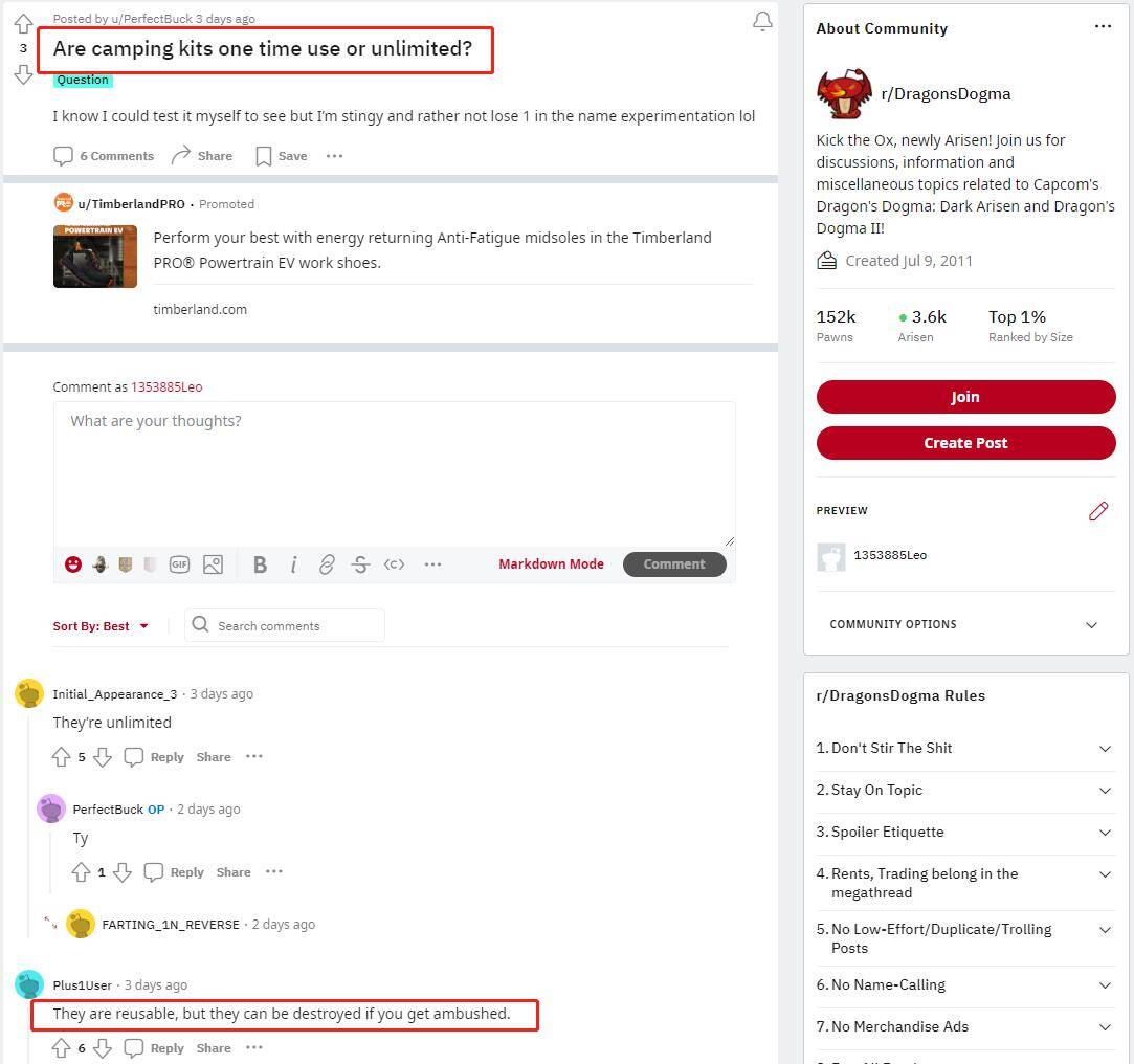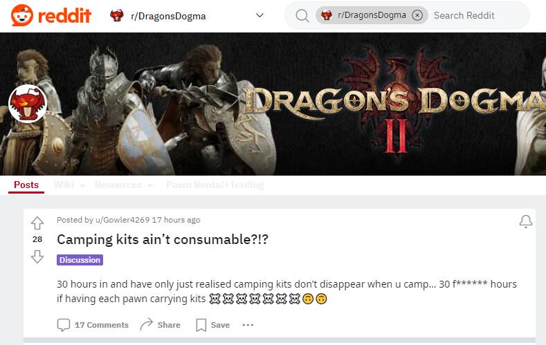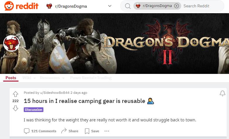 此外在国外论坛reddit的龙之信条板块中,有玩家分别花费了15个小时和30个小时才意识野营工具不会因使用而消耗。