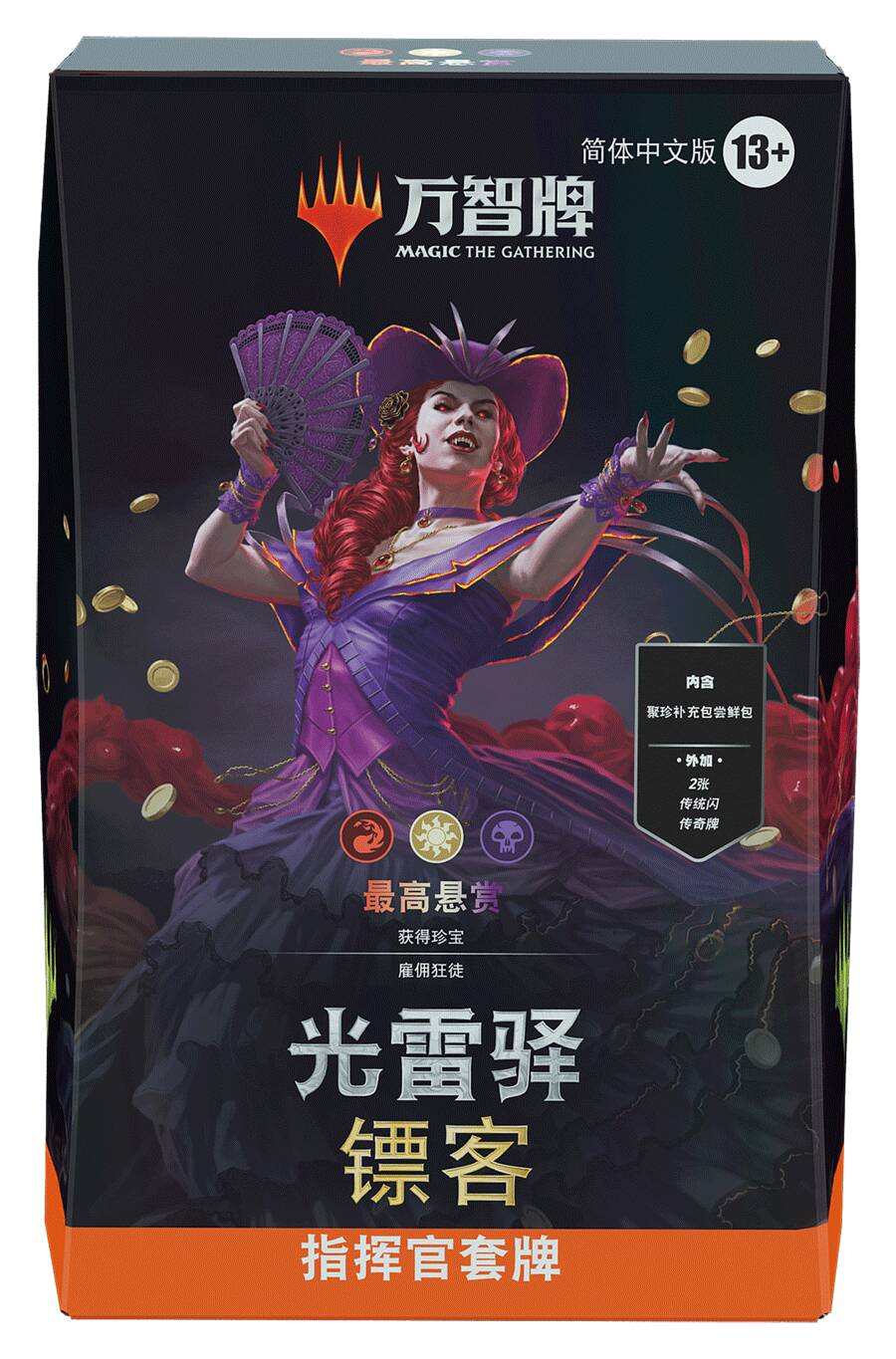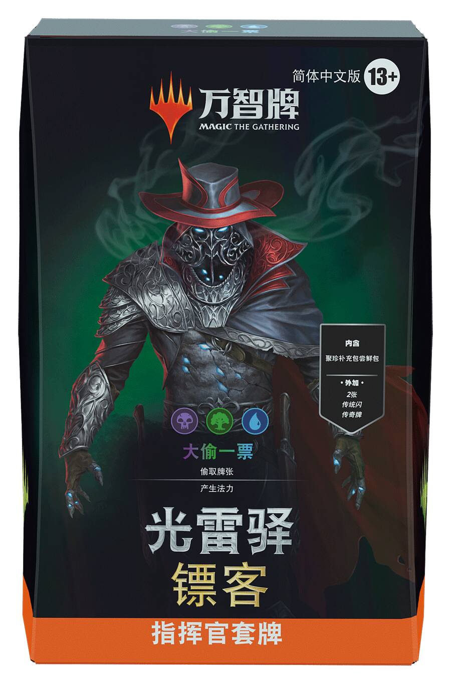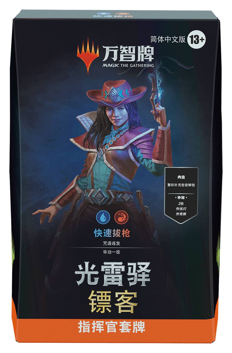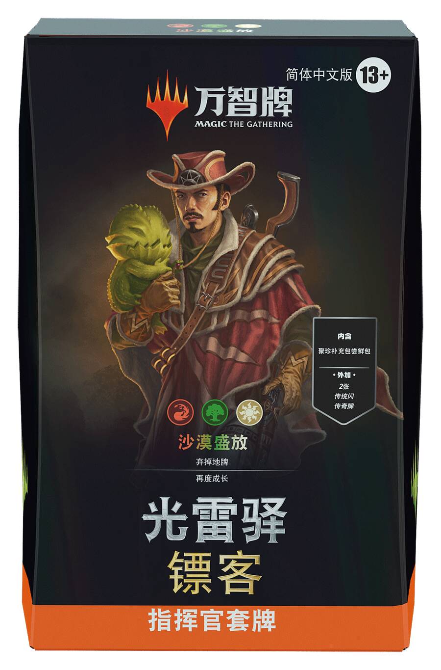 因此,这些指挥官套牌的封面传奇均为传统闪无边框牌。这些传统闪版本的封面牌只能从光雷驿镖客指挥官套牌以及聚珍补充包尝鲜包中开出。不闪的版本可从聚珍补充包中开出。