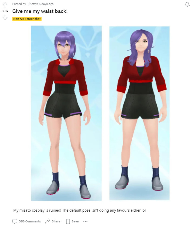 总而言之,Niantic对《宝可梦Go》的“正确”更新,在玩家眼里就是将他们虚拟的少女形象变成了中年发福的大妈。尤其是这位叫做“Aettyr”的reddit用户,他只能无声地控诉Niantic毁了他对《新世纪福音战士》中葛城美里的角色cos。