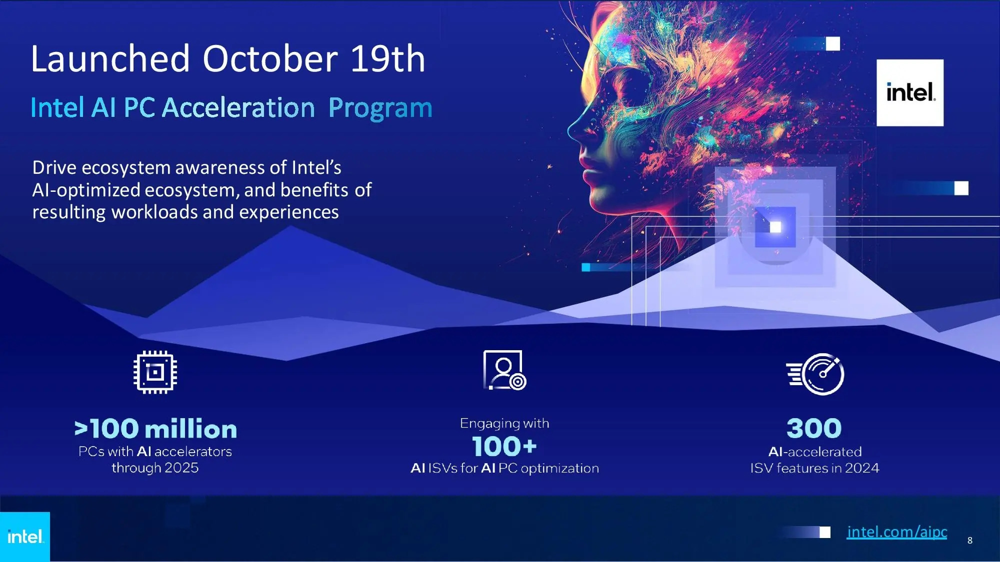 英特尔计划到2025年底交付超过1亿台带有AI加速器的PC,该公司已经与100多家用于PC平台的AIISV合作,并计划到2024年底在市场上推出300多个AI加速应用程序。