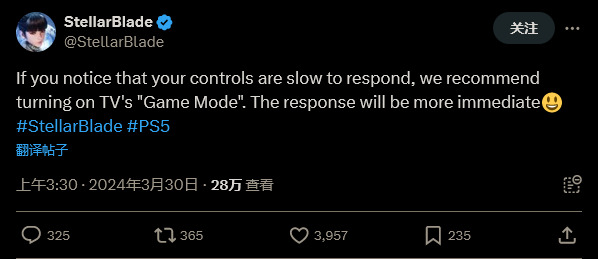 一些玩家报告称,《星刃》最近推出的试玩版在动作手感上有一些卡顿。对此,开发商在推特上回应道:“如果您发现手柄响应缓慢,我们建议您打开电视的游戏模式。(这样)反应会更加迅速。”
