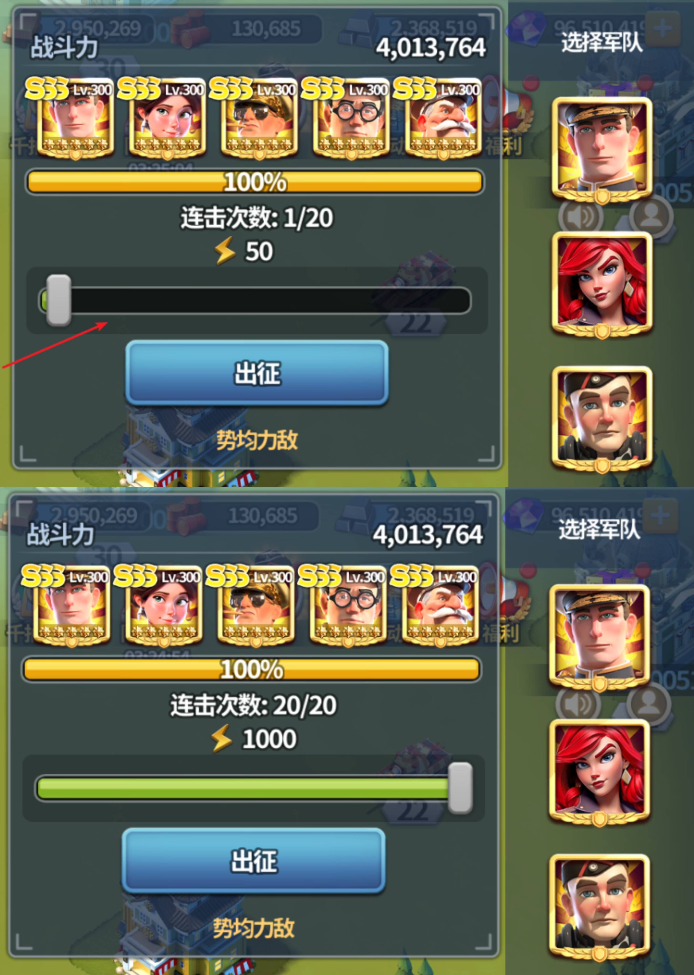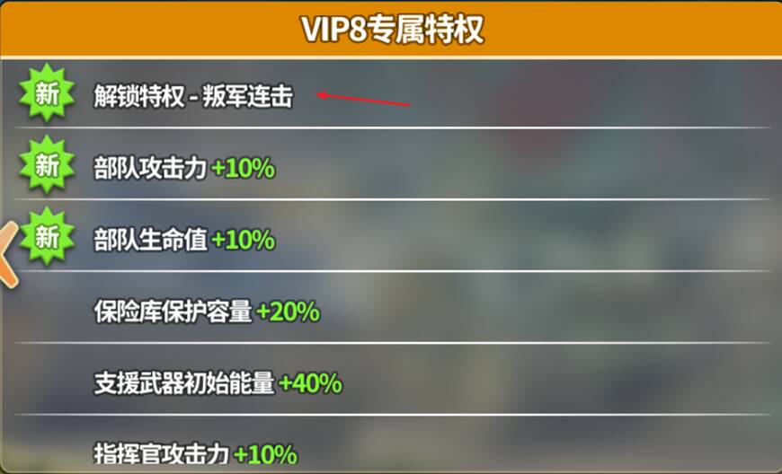 VIP8专属特权中为统帅们提供了「叛军连击」功能,开启后可以快速消耗当前行动力。