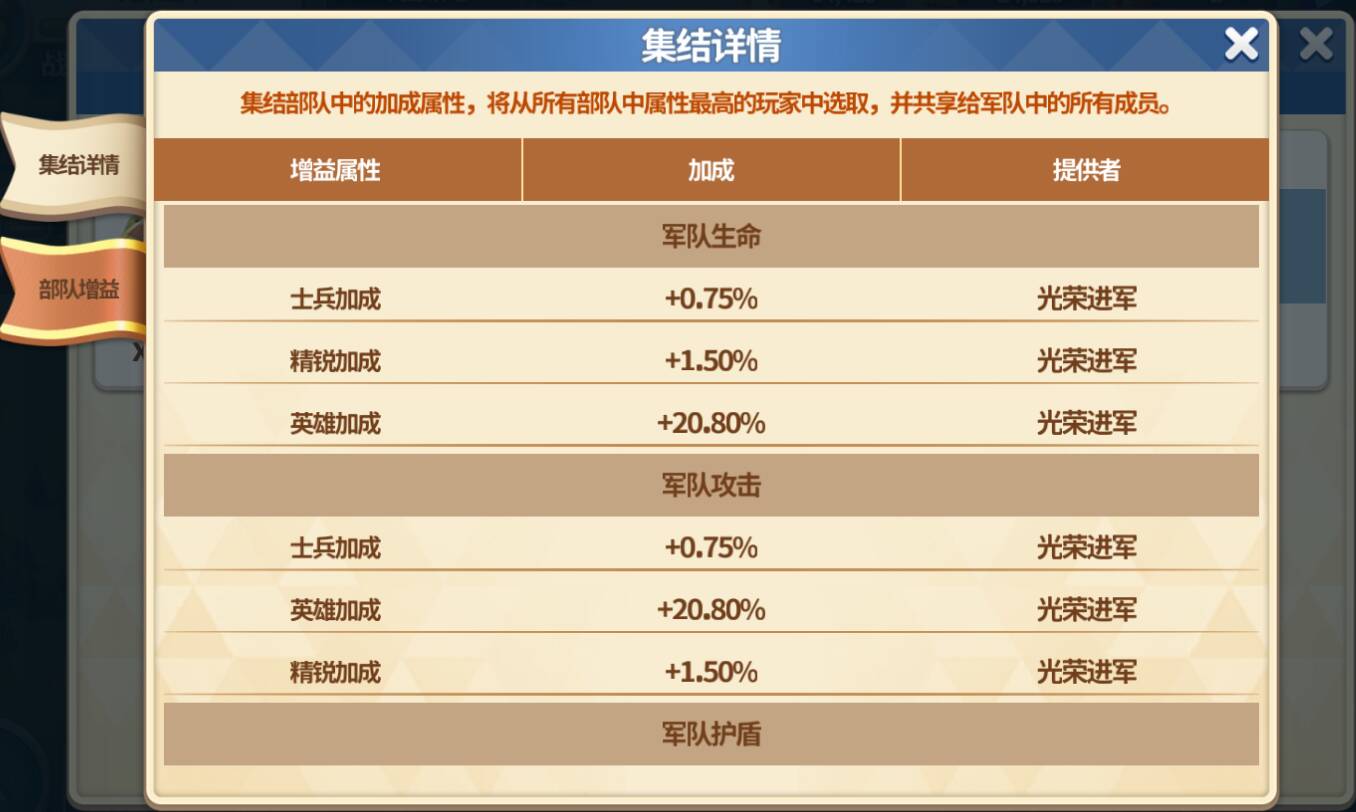 集结成功后点击集结队列可以看到当前的集结详情和部队增益。集结部队中的加成属性,将从所有部队中属性最高的统帅中选取,并共享给军队中的所有成员。与强力的军团成员们一起击败“首领”吧!
