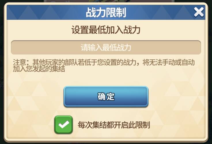 在左上角小齿轮「设置」中,可以设置本次集结队伍的【最低加入战力】,由于集结目标的“首领”实力超群,如果战斗力过低可能会导致集结失败,无法获得全部奖励!