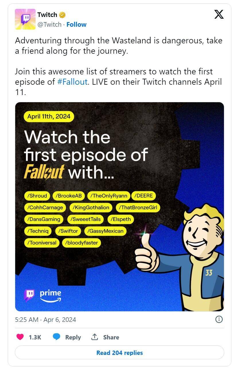 亚马逊的《辐射》改编美剧第一集将于4月11日在Twitch上播出。