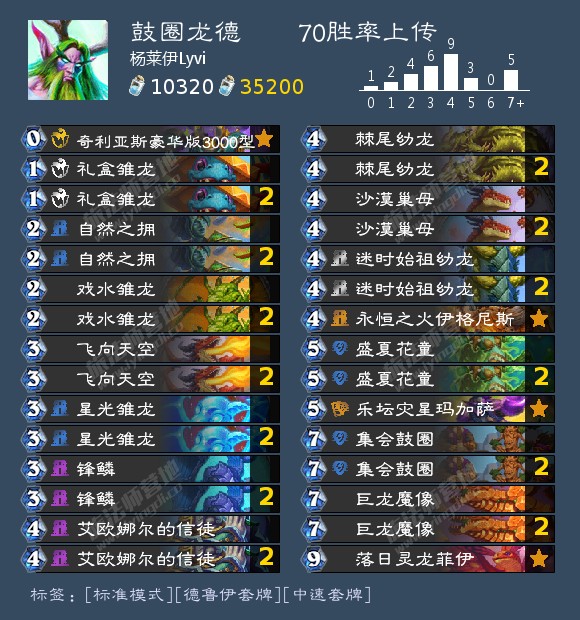 另外还有带提灯艾维娜的铺场龙德,由于提灯削了,我觉得强度是没我这套高的,我这套平均回合数基本都在十回以内,一般8️⃣9️⃣费就结束战斗了。