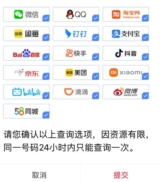 如果想批量清理,联通前年倒是整出了个 “ 注册清理 ” 的服务,现在改名成 “ 一号通查 ” ,填好身份信息,选好要清理的平台,就能静候佳音,基本上等 5 个工作日就行了。