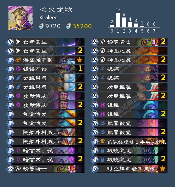 在新版本到来之前,一张牧师的橙卡引起了许多人的注意:时空扭曲者扎里米。惊人的战吼强度使得相当大一部分玩家十分看好这张橙卡,在新版本到来后他也不负众望,成为了与门吼强度并列T0的新门p。这里我贴上一套我在营地里抄的卡组,我也是用这套卡组目前打上了亚服传说前百,但我个人觉得这套卡组的强度是足以登顶的,可惜本人时间不够,加上对这种带控制的卡组不是特别了解导致开始玩时不太适应(绝对不是因为菜笔doge)打到了这个名次。