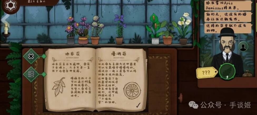 接着,客人们一个接一个来到店铺。开局还是新手,所以先期店里的植物不算多,全摆放在店内。我们需要依照客人的需求,翻阅手头的笔记,确定他们要的到底是哪种植物,最后提交。