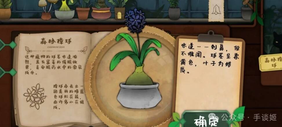 举个例子,有客人说她失眠,我们就通过翻找看到了一种名为“森林樟球”的植物。手册上说樟球会长出暗蓝色球形花簇,从图案上也能看出,花为六瓣,且植物散发出强烈的味道。从一堆植物中将外观疑似森林樟球的对象取下,仔细察看,得到更多味道细节描述,与笔记完全一致,便可以把它交给客人了。完事后还得做个标签(嫌麻烦的话,游戏有自动标签功能)。