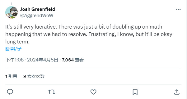 面对通货膨胀的问题,暴雪官方很快做出了修改,但《魔兽世界怀旧服》高级制作人Josh Greenfield之后又发推解释“梦魇入侵”即便是修改后依旧有得赚,“我们必须解决一些数学上的问题”。同时他还安抚玩家,虽然当前的结果“很令人沮丧,但从长远来看,一切都会好起来的”。