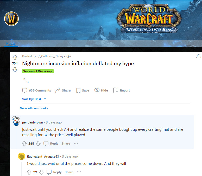 那些没有在一开始享受到“金币加成”的玩家,自然是感觉错过了“发财”的机会,而活动之初过多金币奖励的影响才刚刚显现。要知道游戏中的拍卖行对通货膨胀有着最直观的反应,有玩家表示看到“地精行为”,亲眼目睹其他玩家在拍卖行买下所有的制造品,再以之前3倍的价格出售。