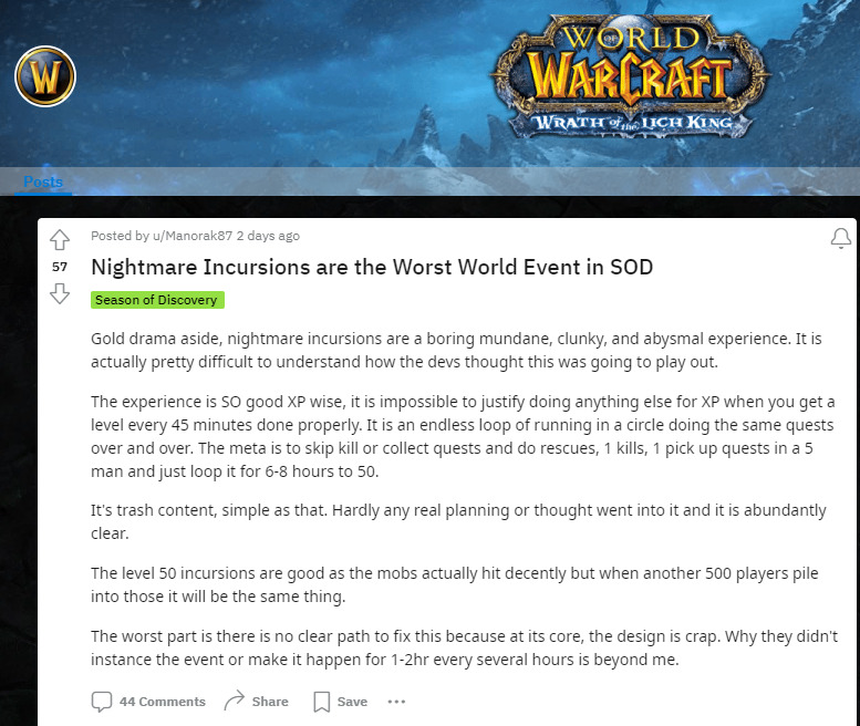《魔兽世界怀旧服》探索季近日开启了第三阶段活动“梦魇入侵”,但这个活动却遭到了不少玩家的批评。