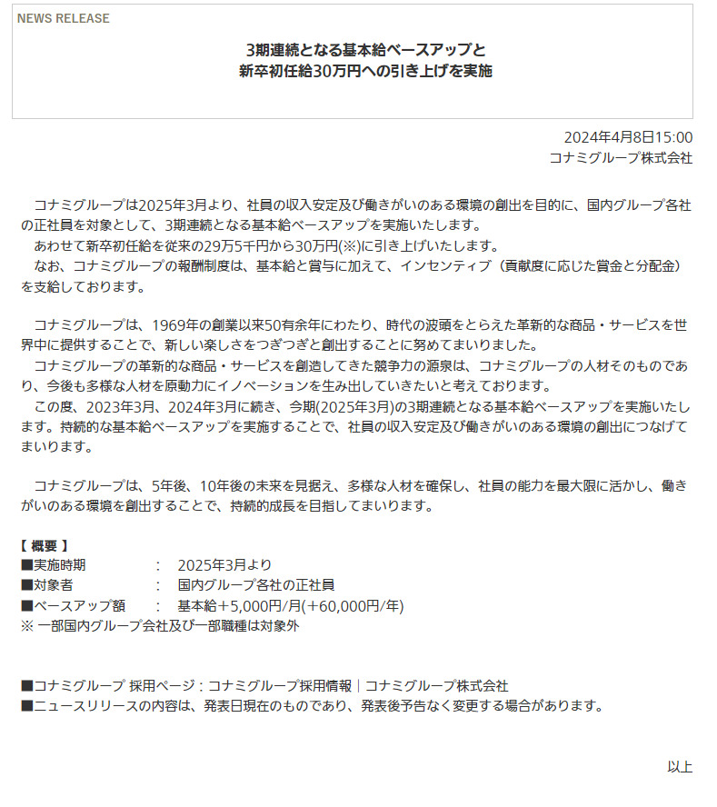 4月8日,科乐美宣布将对日本国内集团公司的全体员工涨薪5000日元,自2025年3月起开始实施,此举旨在稳定员工收入,创造有益的工作环境,这也是科乐美连续第三年实施全体涨薪。科乐美的目标是通过展望未来五到十年、确保多元化的员工队伍、充分发挥员工的能力以及创造有益的工作环境,以实现可持续增长。
