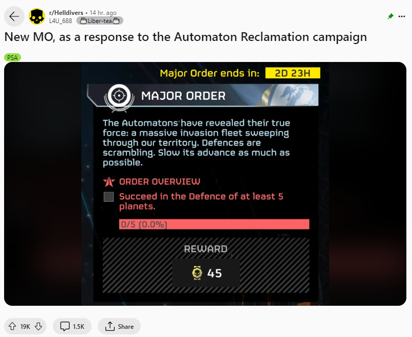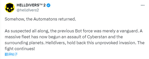 多人合作射击游戏《绝地潜兵2》的动态背景此前来到了玩家相应号召终于全歼银河系中的机器人种族的阶段,但当Arrowhead官方大肆宣传玩家通力合作达成的壮举,以及让玩家对新内容产生期待后的不久,又突然将机器人种族带回游戏中。