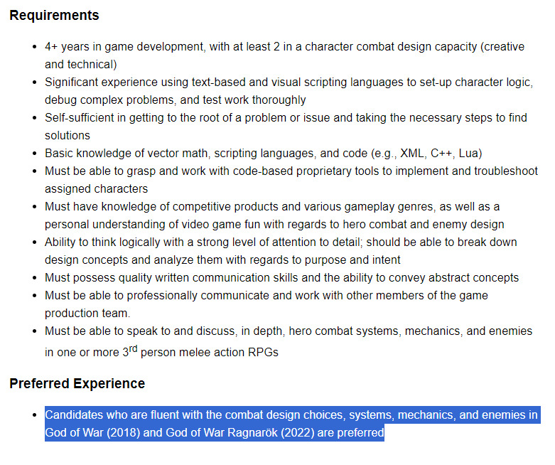 但最后的“优先考虑经验”部分则有些不同,其中明确提到如果熟悉新《战神》(2018年)和《战神:诸神黄昏》(2022年)的战斗设计选择、系统、机制和敌人的应聘者,将优先考虑。