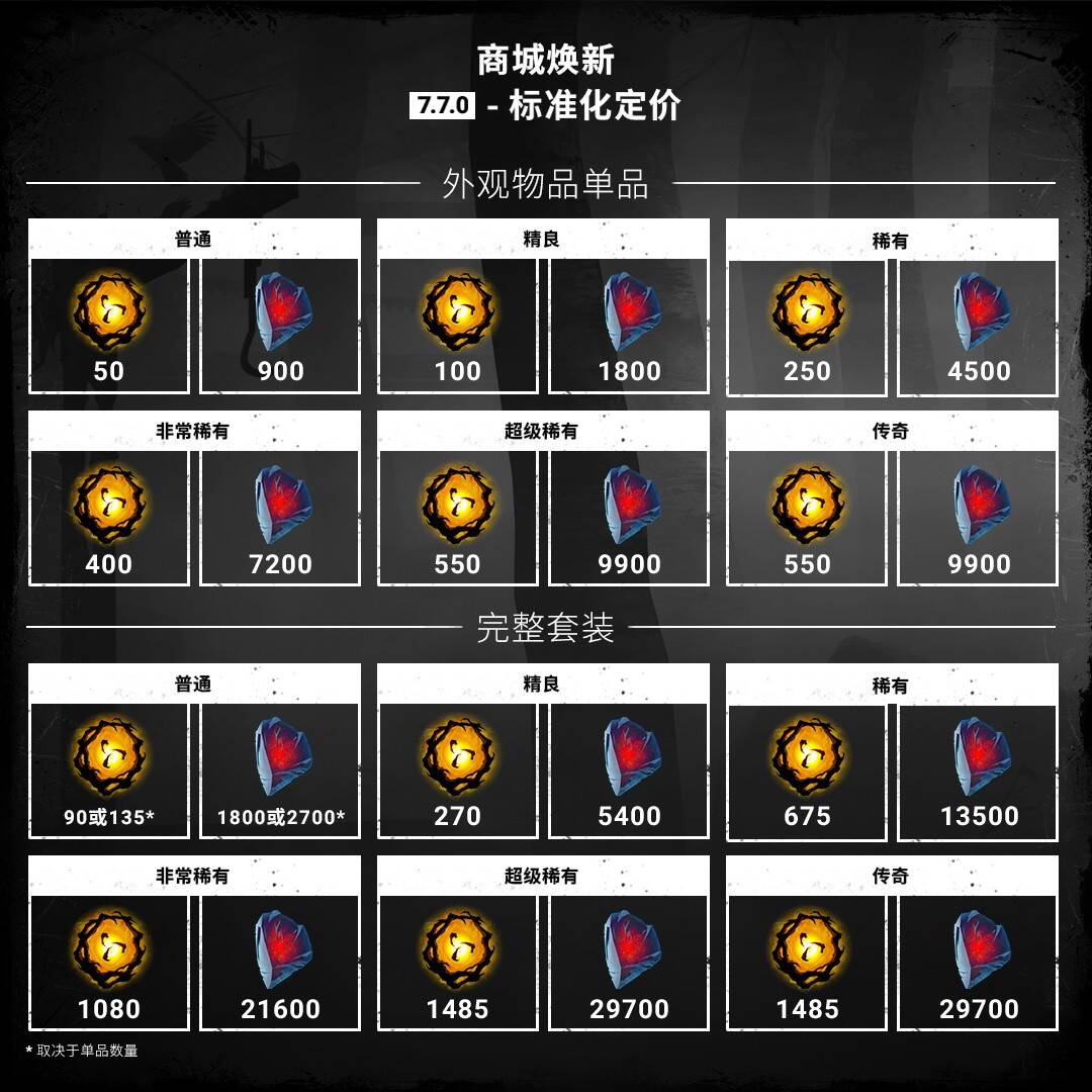 《黎明杀机》官方宣布,随着7.7.0版本全新游戏内商城的推出,他们将对游戏中绝大多数稀有度外观物品的价格进行统一,有接近130件外观物品的价格会因此降低但有3件外观物品的价格会上涨:恶魔杀手(套装),经典鬼面(头部单品),水坑先生(套装),新定价将在4月23日开始生效。