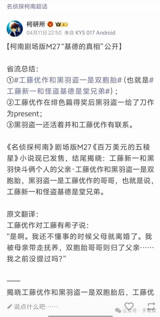 4月12日,M27《100万美元的五角星》在日本正式上映,国内这边再度传出电影的剧透情报,当然了观众们普遍对于剧场电影的推理细节没啥兴趣,这次大家在热议的是“工藤优作和黑羽盗一”居然是亲兄弟……