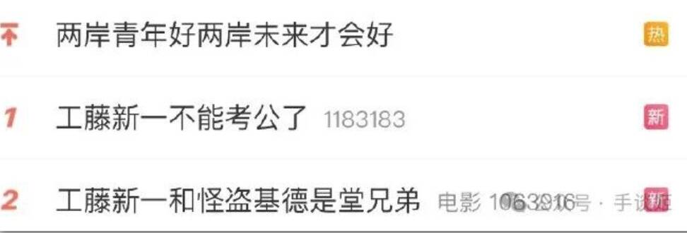 这不,“工藤新一不能考公”这个标签在今天突然就冲上热搜了,咱也不知道这个热搜是谁、哪里的人、抱着什么目的买的,但总之就像是被塞了一大口老北京美式炸鸡那样,产生了一股特别顶的岁月感。