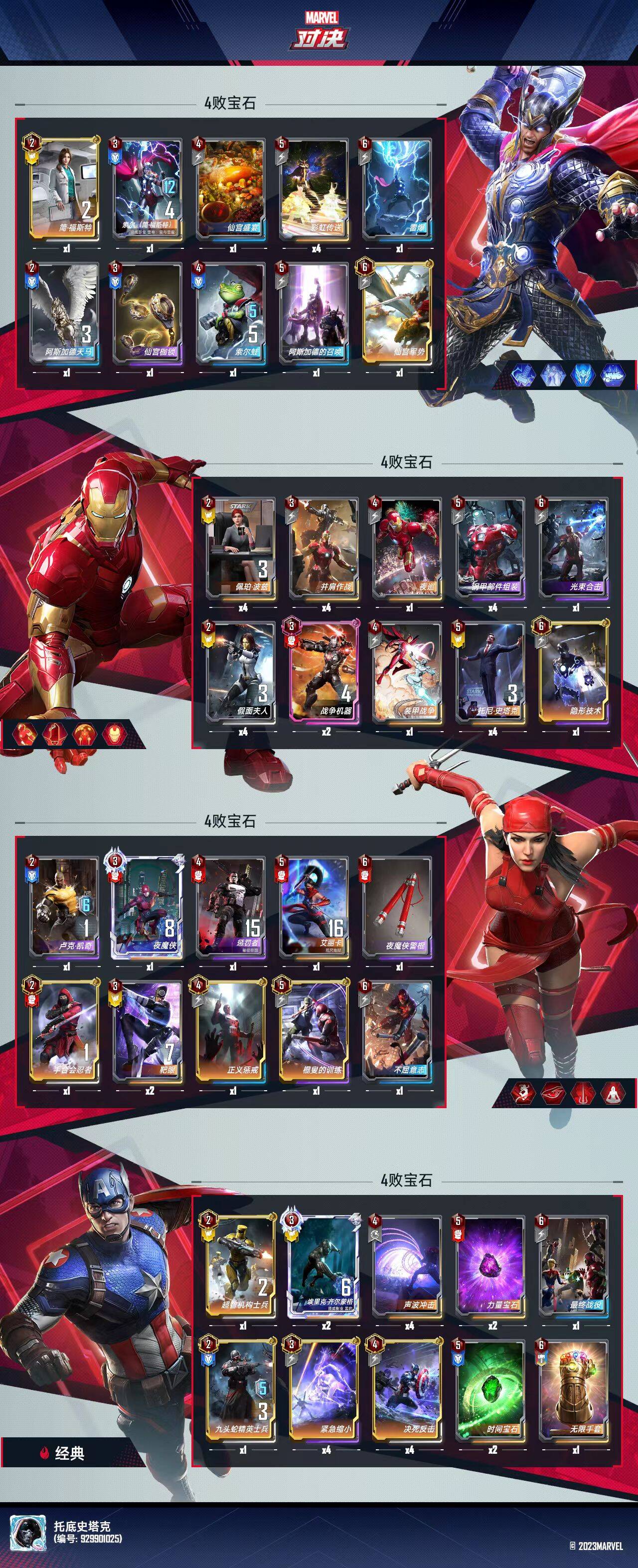 大家好,我是托底史塔克,ID929901025,这个赛季初我也是无数飞刀队的一员,全能战士太过超模,红队的成长,黄队的伤害,还有免伤,强度属实高,上周29%的使用率也可见一斑,用飞刀到大师以后,偶然在群里看到ID慌得要死这兄弟在讨论时间宝石的玩法,了解了以后我发现时间宝石这玩意更加超模,然后就开始宝石的玩法,中间用过维度、星爵、死侍、飞刀来搭配,最终摸索出现在这一套,然后也是用这一套用昨晚上的时间顺利从大师3上王,以下进入正文: