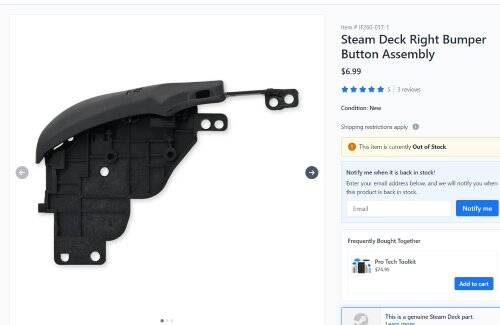 但好消息是,V社鼓励用户自行维修,设立了网站专门销售替换用零件并提供详细教程,他在联系V社客服并告知损坏情况后,对方只发来四个链接,不禁让他惊讶:“只用买4个零件吗?不可能这么简单的吧?”这样的话,这位网友只用花60美元左右就能搞定。