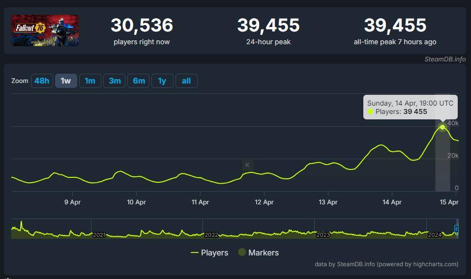 自亚马逊《辐射》真人电视剧播出以来,《辐射》系列游戏的玩家数量迎来一波小爆发,其中根据SteamDB的数据显示,《辐射76》Steam同时在线玩家人数创下了发售以来的新纪录,达到了39455人,对比平时增加了360%以上。