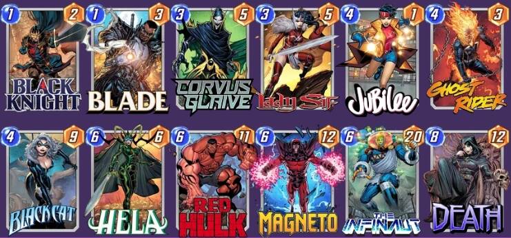 “没朋友”套路最杰出的代表,只要【海拉】不被弃掉就已经赢了一半;即使不幸失去我们的“死亡女神”,也能靠【亡刃将军】的跳费效果接上【红浩克】等坚实大哥稳定压场,已经完全替代原本“电沙”的作用。这副卡组最需要的就是一颗虔诚的心,用力祈祷每一局不要牌库倒抽或海拉弃走即可。